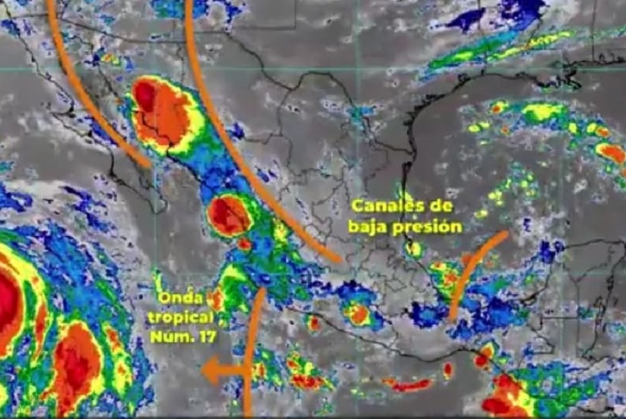 De acuerdo con el reporte oficial emitido este domingo por el Servicio Meteorológico Nacional (SMN), se informa que canales de baja presión, la Onda Tropical No. 17 y el monzón mexicano ocasionarán lluvias fuertes (de 25 a 50 milímetros) en Colima, Jalisco, Ciudad de México, Estado de México, Chihuahua, Durango, Morelos, Sinaloa y Sonora. Las lluvias se acompañarán de descargas eléctricas y condiciones para la caída de granizo.