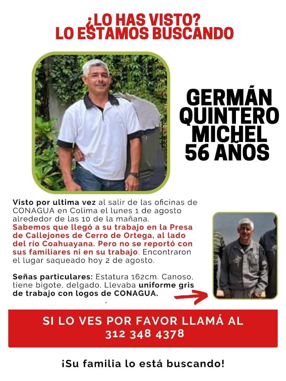Cabe señalar que Germán Quintero Michel tiene una estatura de un metro con 62 centímetros, pelo canoso, con bigote, complexión delgada y al momento de desaparecer llevaba el uniforme de color gris con logotipos de CONAGUA.