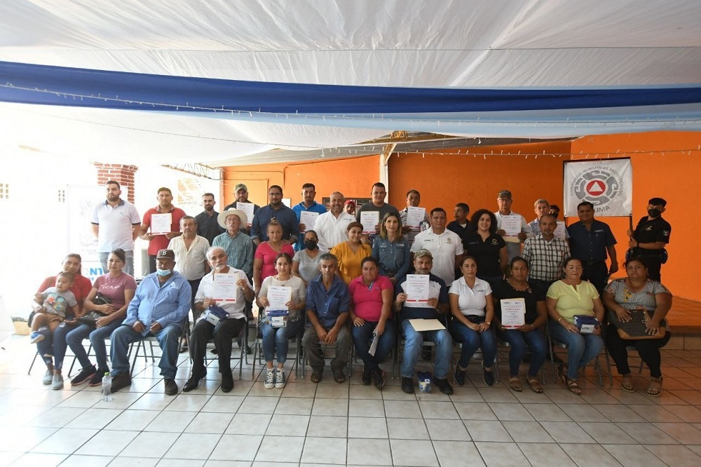 La presidenta municipal de Colima, Margarita Moreno, entregó certificados de la capacitación que recibieron, por primera vez, las y los comisarios de 29 comunidades rurales del municipio, en materia de gestión integral del riesgo y reducción de la vulnerabilidad en sus comunidades ante emergencias o desastres.