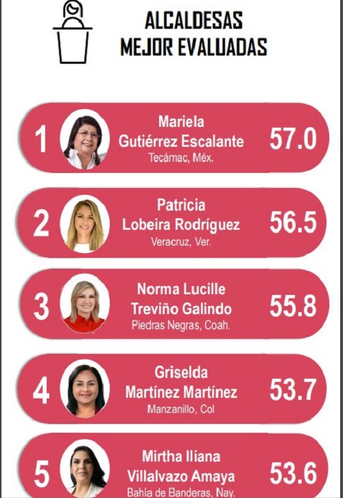 Manzanillo, Col. De acuerdo con las mediciones que periódicamente publica Consulta Mitofsky, relativas a la evaluación sobre la aprobación ciudadana de alcaldes y alcaldesas de 150 ciudades representativas del territorio nacional, de los 2 mil 471 municipios que existen, para este mes de agosto de 2022, la encuestadora vuelve a situar a la presidenta manzanillense Griselda Martínez en el top de las 5 mejores alcaldesas, dándole el cuarto sitio en ese ranking femenil.