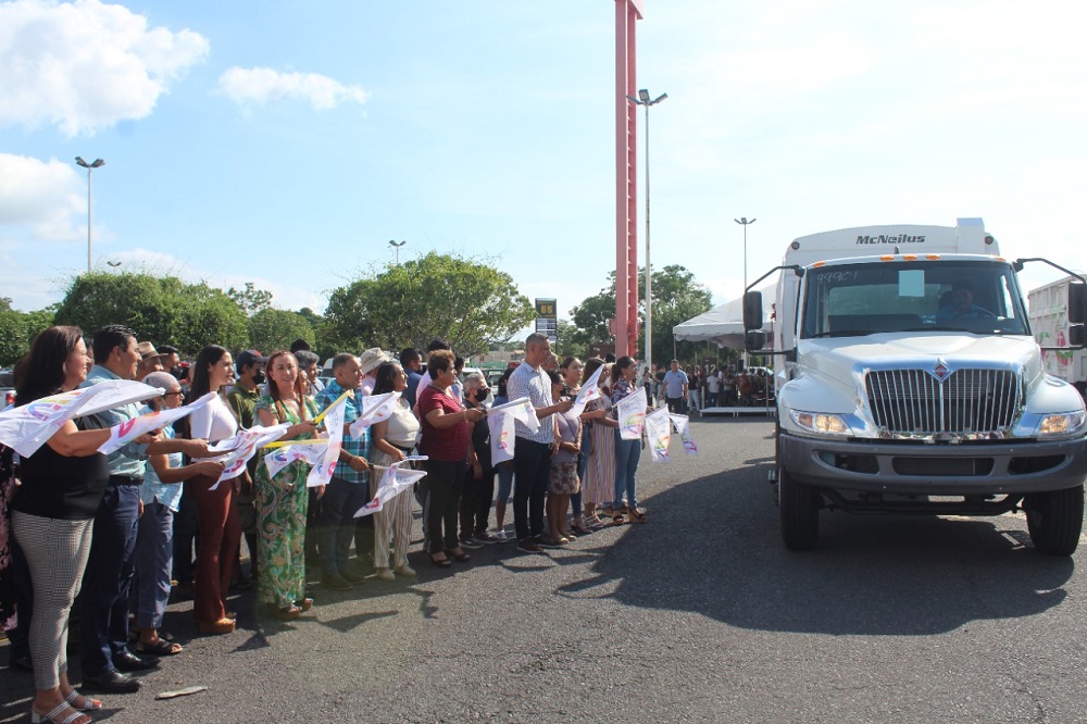 Los vehículos entregados, adquiridos en su totalidad con la recaudación de contribuciones municipales, son un camión a cielo abierto de 14 toneladas de carga, un camión compactador de basura de 10 toneladas de carga y un tractor para la limpieza de áreas verdes y lotes baldíos.