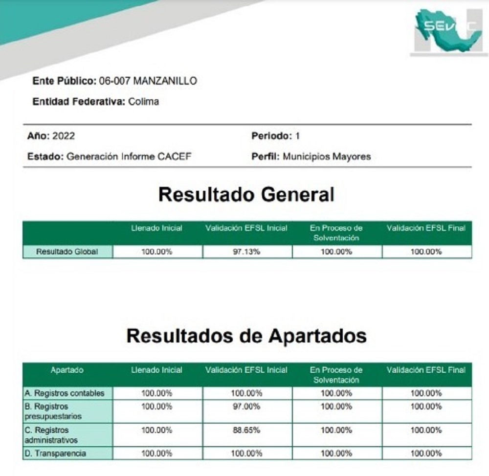 De acuerdo con la última evaluación nacional, correspondiente al primer semestre de este 2022 realizada por el Sistema de Evaluaciones de la Armonización Contable (SEvAC), el Ayuntamiento de Manzanillo cumplió en su totalidad con las obligaciones de transparencia correspondiente a su armonización contable.