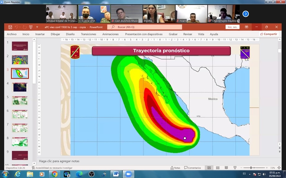 Asimismo, en la sesión se informó que el huracán Kay de categoría 1 en la escala Saffir-Simpson, actualmente se encuentra a 510 kilómetros al sureste de Manzanillo Colima, desplazándose a 7 kilómetros por hora hacia el oeste, previendo una trayectoria que continuará alejándose; por lo tanto, se espera que para las siguiente 24 horas disminuyan sus efectos.