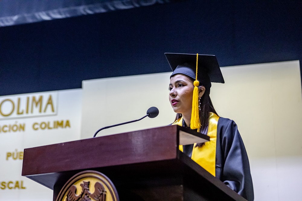 En nombre de los egresados de licenciatura, Brianda Fernanda Orozco Rodríguez recordó cómo fueron los primeros semestres como estudiantes; “nuestras vidas han cambiado mucho desde entonces, y aunque ahora podemos presumir que llegamos hasta aquí, quizá en algún punto de estos cuatro años creímos que este día jamás llegaría. Hoy todo ha valido la pena, porque se lo puedes dedicar a todas esas personas que en ningún momento dudaron, a tus papás, a tus hermanos, abuelos, profesores. Cualquier cosa es posible si tienes suficiente valor”.