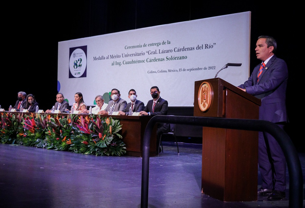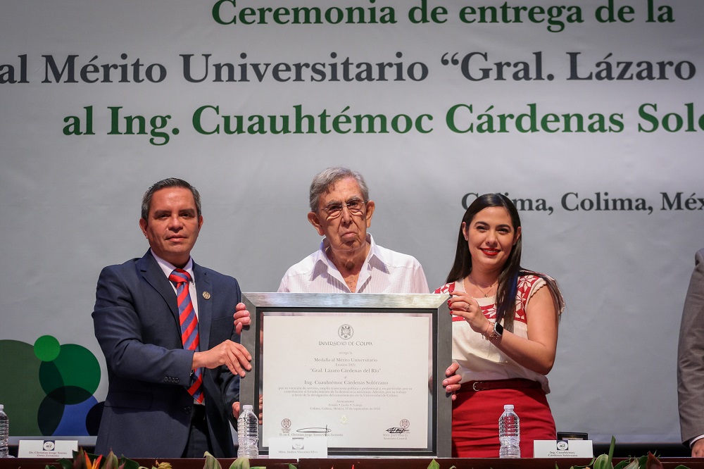 Congregados en el Teatro Universitario, este martes la comunidad universitaria encabezada por su rector, Christian Jorge Torres Ortiz Zermeño, entregó al Ing. Cuauhtémoc Cárdenas Solórzano la medalla al Mérito Universitario “General Lázaro Cárdenas del Río” por su vocación de servicio, amplia trayectoria política y profesional, por su contribución al fortalecimiento de la democracia mexicana y por su trabajo en favor de la divulgación de conocimiento en la Universidad de Colima.