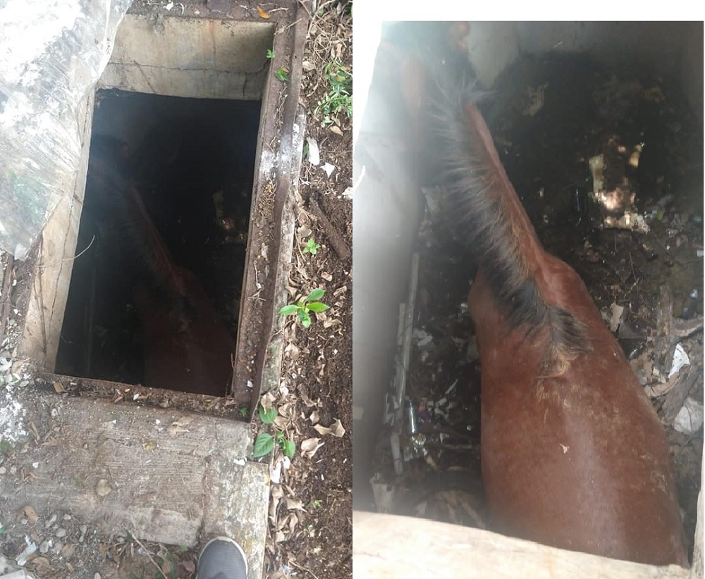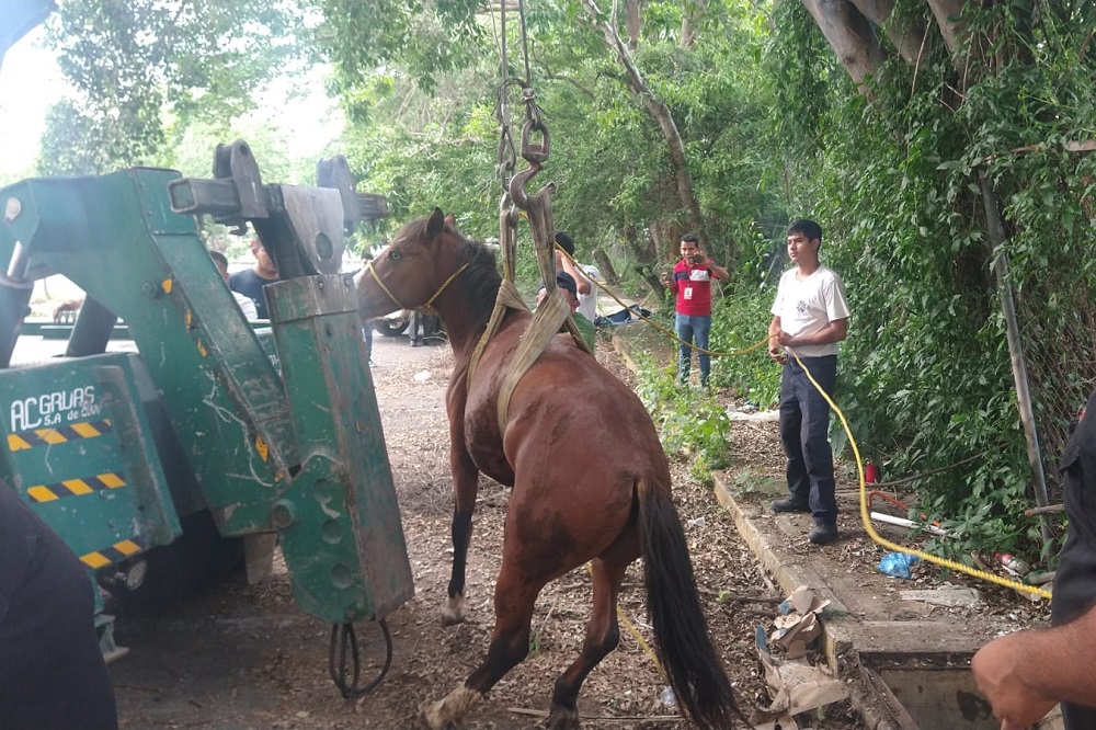Villa de Álvarez, Col. Elementos de la Unidad Municipal de Protección Civil de Villa de Álvarez, rescataron este martes por la tarde a un caballo que, de manera accidental, había caído a una cisterna localizada en el estacionamiento de la ex Comercial Mexicana.