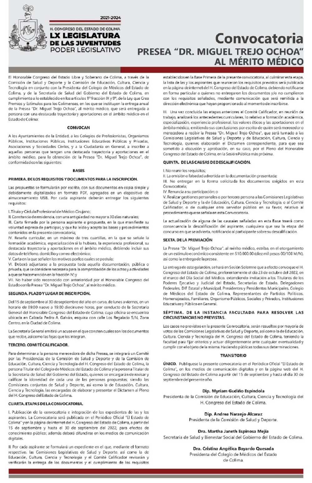 El H. Congreso del Estado Libre y Soberano de Colima, a través de la Comisión de Salud y Deporte y la Comisión de Educación, Cultura, Ciencia y Tecnología en conjunto con el Colegio de Médicos del Estado de Colima, y de la Secretaría de Salud del Gobierno del Estado de Colima, emitió la convocatoria a la Presea “Dr. Miguel Trejo Ochoa” al mérito médico, que será entregada a persona con una destacada trayectoria y aportaciones en el ámbito médico en el Estado de Colima.
