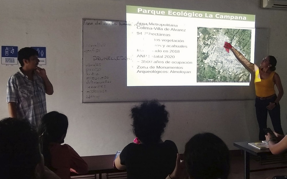 La bióloga Delia Caldera Cano y el biólogo Emanuel Ruiz Villarreal visitaron las instalaciones de la ex Hacienda de El Cóbano, sede del Departamento de Artes Visuales del Instituto Universitario de Bellas Artes (IUBA) de la Universidad de Colima, para hablar sobre la flora y fauna del Jardín Etnobiológico La Campana y sobre las posibilidades de interacción y trabajo conjunto entre biólogos y artistas.