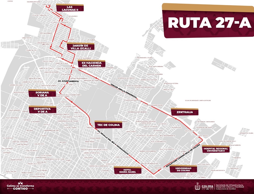 El Gobierno del Estado de Colima, a través de la Subsecretaría de Movilidad, informa la reincorporación de la ruta 27-A del transporte público colectivo al servicio de las y los colimenses de la zona metropolitana Colima-Villa de Álvarez, que, tras su suspensión durante 2 años a causa de la pandemia, reanudará sus recorridos a partir del lunes 3 de octubre.