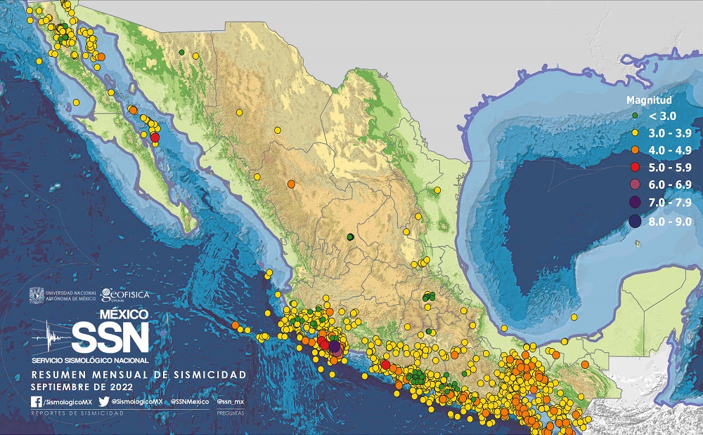 En el mes de septiembre de 2022, el Servicio Sismológico Nacional reportó 2 mil 603 sismos con epicentros dentro de territorio mexicano. Las magnitudes de estos eventos se encuentran en un rango entre 1.2 y 7.7.