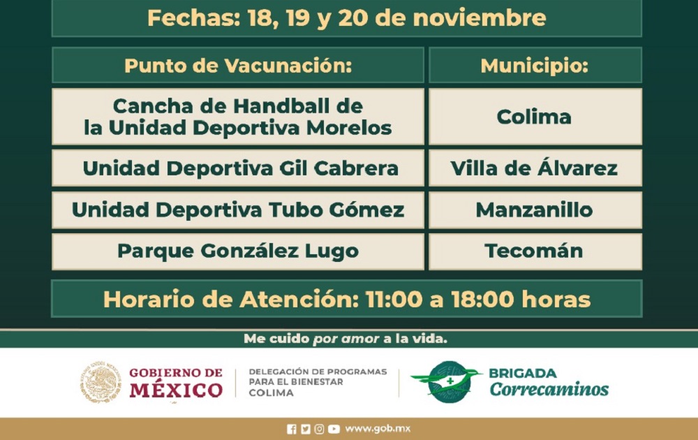 Los días 18, 19 y 20 de noviembre habrá Macrocentros de Vacunación en Colima, Villa de Álvarez, Tecomán y Manzanillo, en los lugares y horarios que se indican en el recuadro anexo.