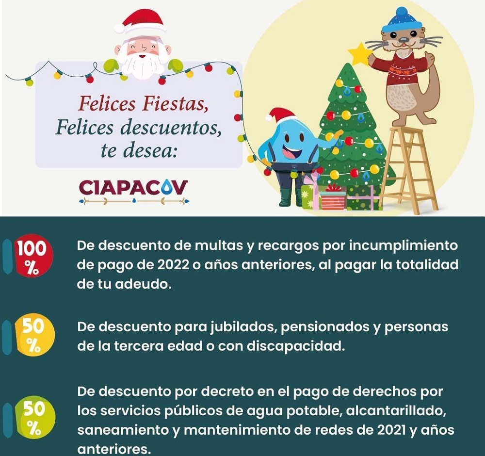 La Comisión de Agua Potable y Alcantarillado de los municipios de Colima y Villa de Álvarez (CIAPACOV) invita a sus usuarios a aprovechar las últimas dos semanas con descuentos para ponerse al corriente en sus adeudos en el servicio de agua. Estos solo estarán disponibles hasta el 31 de diciembre y son los siguientes: