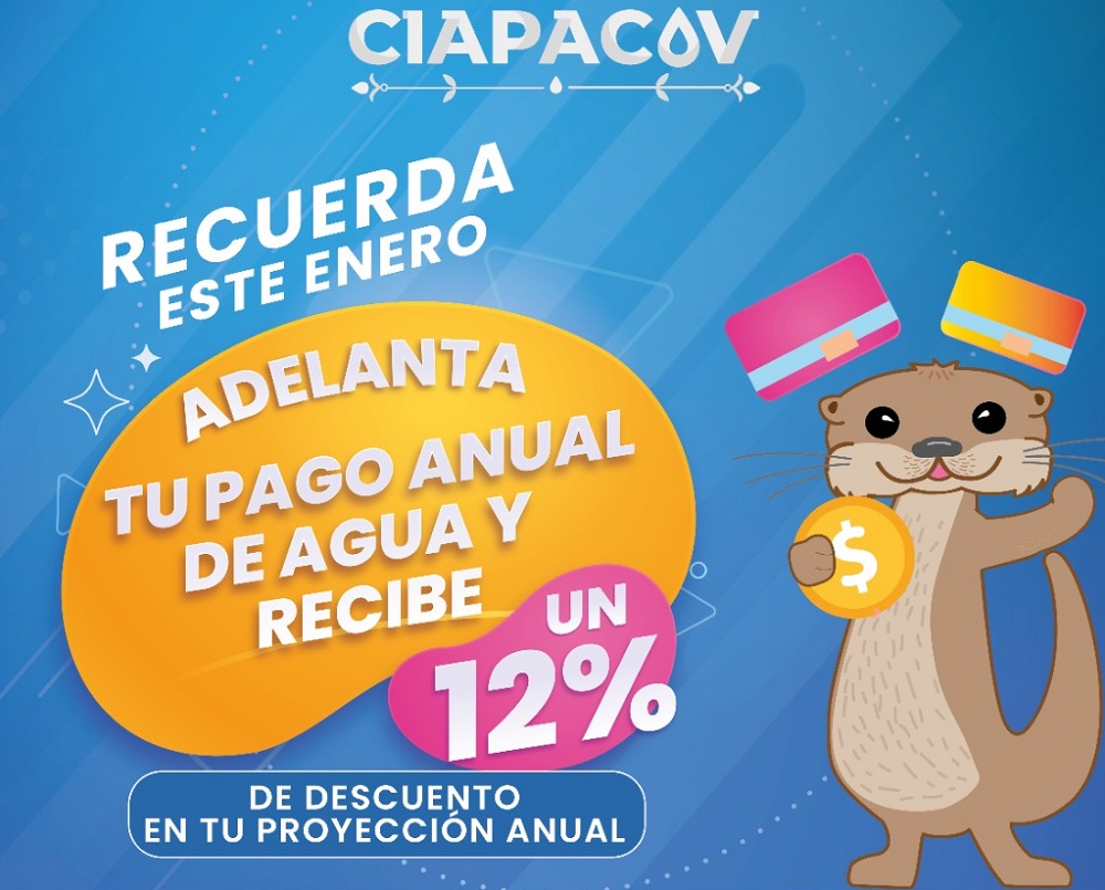 La Comisión de Agua Potable y Alcantarillado de los municipios de Colima y Villa de Álvarez (CIAPACOV) invita a pobladores de ambos municipios, a aprovechar el descuento del 12% en el pago anual anticipado de su servicio de agua potable, durante el mes de Enero. Promoción pensada para agradecer a los usuarios cumplidos por su pago puntual.