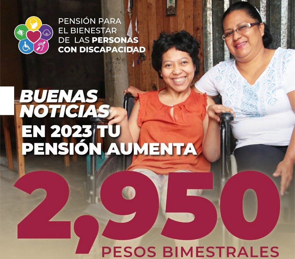 La Pensión para el Bienestar de las Personas con Discapacidad se incrementa de dos mil 800 pesos en 2022 a dos mil 950 pesos bimestrales en 2023, en beneficio de más de un millón 300 mil derechohabientes, anunció la secretaria de Bienestar, Ariadna Montiel Reyes.