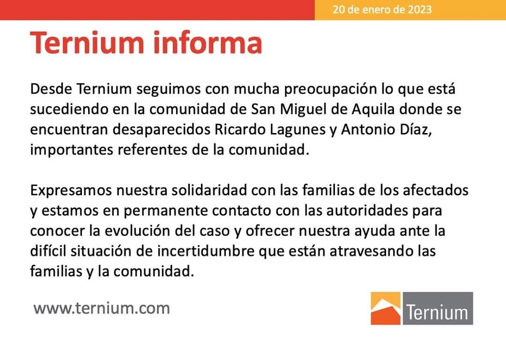 Queremos informarles que desde Ternium seguimos con mucha preocupación lo que está sucediendo en la comunidad de San Miguel de Aquila donde se encuentran desaparecidos Ricardo Lagunes y Antonio Díaz, importantes referentes de la comunidad.