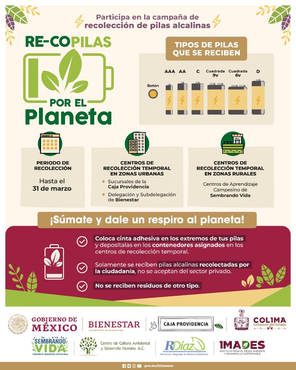 El Gobierno de México, a través del programa Sembrando Vida; el Gobierno del Estado, a través de Instituto para el Medio Ambiente y Desarrollo Sustentable (Imades); Caja Popular La Providencia y R. Díaz (Servicios Integrales en Materia Ambiental), invitan a las y los colimenses a participar en la campaña Re-Copilas Por el Planeta, cuyo objetivo es limpiar nuestro estado de los contaminantes de las pilas alcalinas.