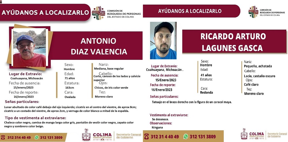 Cualquier información que abone a la localización de Arturo Lagunes Gasca y Antonio Díaz Valencia puede ser reportada vía telefónica al 312-314-4049, o bien, por WhatsApp al 312-131-3809.