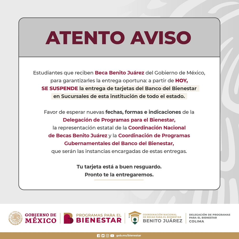 Con la finalidad de garantizar la entrega de forma oportuna a las y los beneficiarios, a partir de hoy las sucursales del Banco del Bienestar de todo el estado suspenden la entrega de tarjetas a estudiantes que tienen la Beca "Benito Juárez", informó la delegada de Programas para el Bienestar, Viridiana Valencia Vargas, para luego explicar que la dependencia a su cargo, en conjunto con la representación en Colima de la Coordinación de Becas Benito Juárez y la Coordinación de Programas Gubernamentales del Banco del Bienestar, se harán cargo de realizar este trámite.