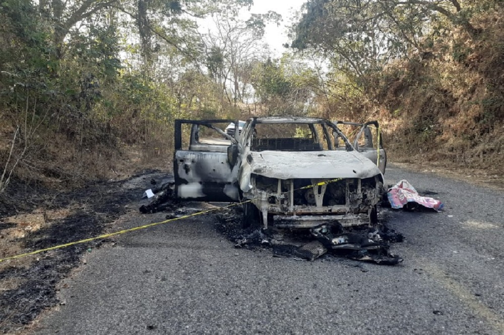 Chinicuila, Mich. Este viernes por la mañana las autoridades el municipio de Chinicuila recibieron el reporte del hallazgo en la carretera que va a Aquila, en las inmediaciones de la localidad de La Nuez, de un vehículo incendiado en cuyo interior había cuatro personas acribilladas a balazos y parcialmente quemadas, y cerca del automotor, dos individuos más también muertos por disparos de arma de fuego.