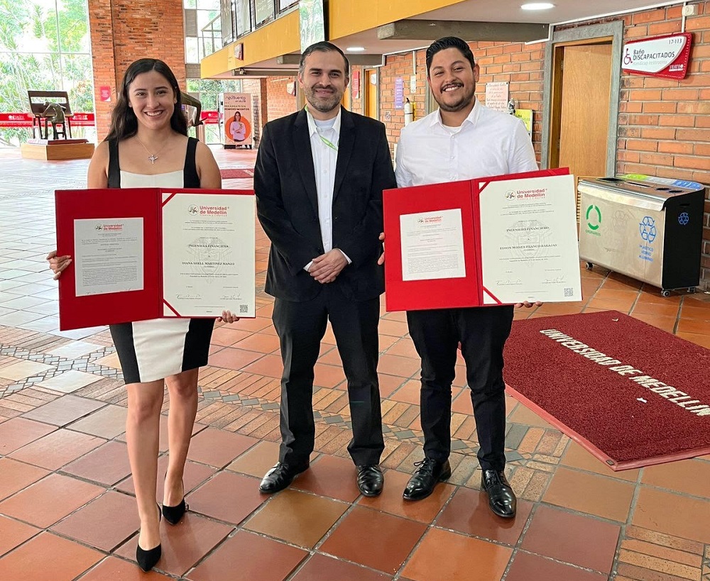 Diana Shell Martínez Manzo y Edson Moisés Franco Barajas, de la Facultad de Economía de la Universidad de Colima, culminaron su proceso de doble titulación al recibir sus títulos de la carrera en Ingeniería Financiera por la Universidad de Medellín, en Colombia.