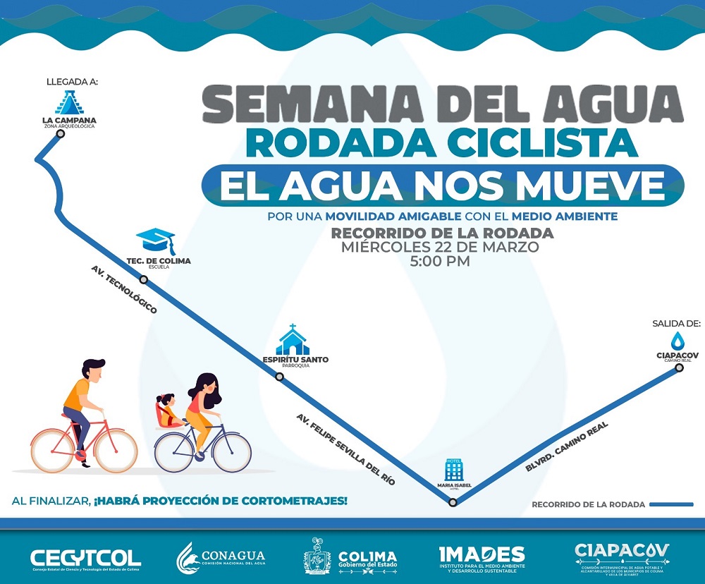 El Gobierno del Estado de Colima, a través de la Subsecretaría de Movilidad (Subsemov), el Instituto para el Medio Ambiente y Desarrollo Sustentable (Imades), en coordinación con la Comisión Intermunicipal de Agua Potable y Alcantarillado de Colima y Villa de Álvarez (Ciapacov) y la Dirección de Ecología y Medio Ambiente de Colima, invitan a la rodada ciclista “El agua nos mueve”, para promover alternativas de transporte, más allá de vehículos particulares. Esto en el marco de la Semana del Agua promovida por Ciapacov, en la que se realizarán actividades para hacer conciencia sobre el vital líquido y la importancia que tiene en los polígonos urbanos.