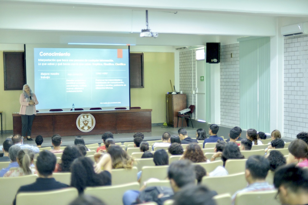 “El conocimiento mejora nuestro entorno, nos conecta a través de la colaboración, erradica mitos y prejuicios y es un activo estratégico”, les dijo la investigadora Xóchitl Trujillo-Trujillo a las y los alumnos de los programas de Economía y Finanzas, durante la charla que dio con motivo del Seminario de Academia 2023 que realiza dicho plantel para fortalecer la adquisición de conocimiento de su alumnado.
