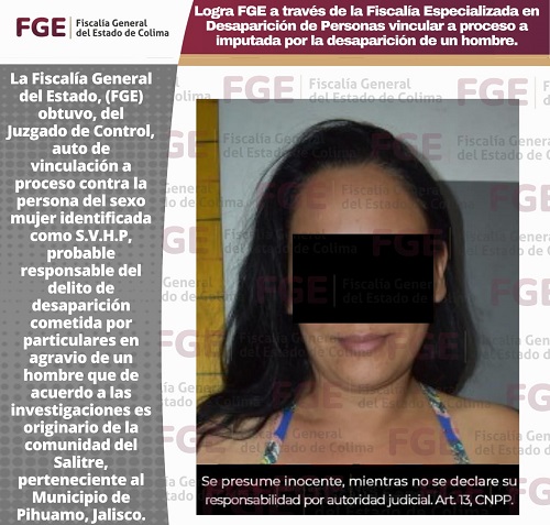 La Fiscalía General del Estado, (FGE) obtuvo, del Juzgado de Control, auto de vinculación a proceso contra la persona del sexo mujer identificada como S.V.H.P, probable responsable del delito de desaparición cometida por particulares en agravio de un hombre que de acuerdo a las investigaciones es originario de la comunidad del Salitre, perteneciente al Municipio de Pihuamo, Jalisco.