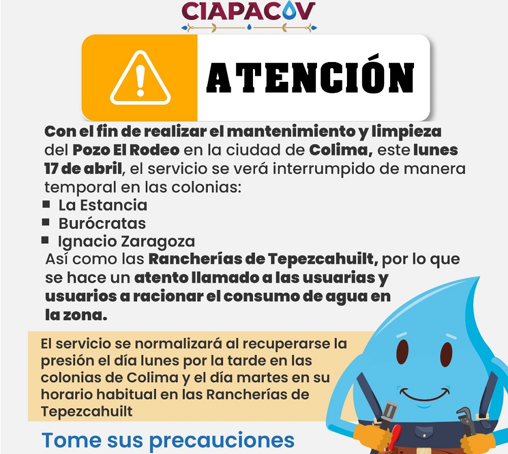 Este lunes 17 de abril, la Dirección de Redes de Agua de la Comisión Intermunicipal de Agua Potable y Alcantarillado de los Municipios de Colima y Villa de Álvarez (CIAPACOV), realizará trabajos de mantenimiento en el Pozo El Rodeo en la Ciudad de Colima.