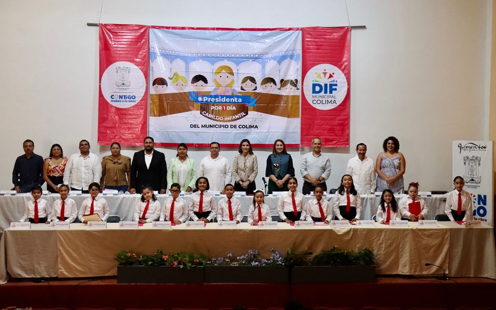 En el marco del próximo Día de la niñez, el Ayuntamiento de Colima, en coordinación con el DIF Municipal Colima realizó la sesión de Cabildo Infantil 2023, “Presidenta por un día”, que fue encabezada por la presidenta municipal Margarita Moreno y el Cabildo capitalino, la presidenta municipal infantil Emilia Denisse Saucedo, así como el síndico, secretaria, regidoras y regidores infantiles.