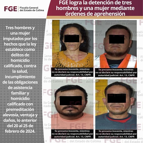 Tres hombres y una mujer imputados por los hechos que la ley establece como delitos de homicidio calificado, contra la salud, incumplimiento de las obligaciones de asistencia familiar y homicidio calificado con premeditación alevosía, ventaja y daños, lo anterior del 20 al 25 de febrero de 2024.