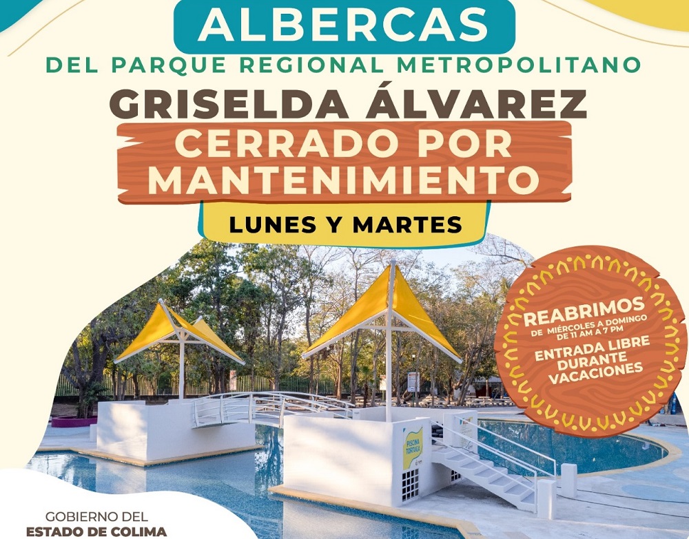 Para brindar mantenimiento y realizar limpieza general a las instalaciones, las Albercas del Parque Regional Metropolitano ‘Griselda Álvarez’ de Colima, estarán cerradas este lunes y martes, reabriendo a la población del miércoles 3 al domingo 7 de abril, de las 11:00 de la mañana a las 7:00 de la tarde.