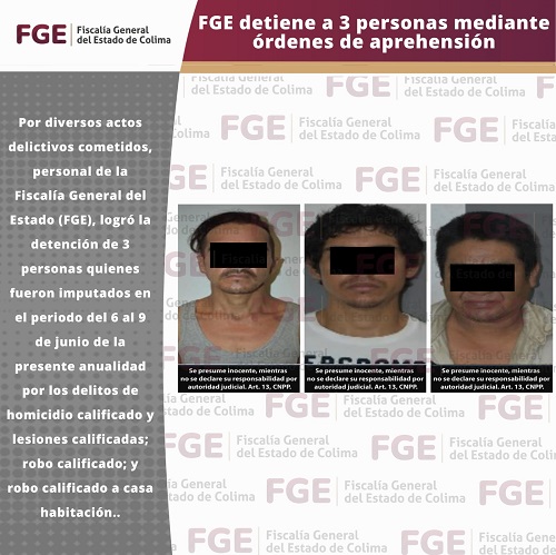 Por diversos actos delictivos cometidos, personal de la Fiscalía General del Estado (FGE), logró la detención de 3 personas quienes fueron imputados en el periodo del 6 al 9 de junio de la presente anualidad por los delitos de homicidio calificado y lesiones calificadas; robo calificado; y robo calificado a casa habitación.