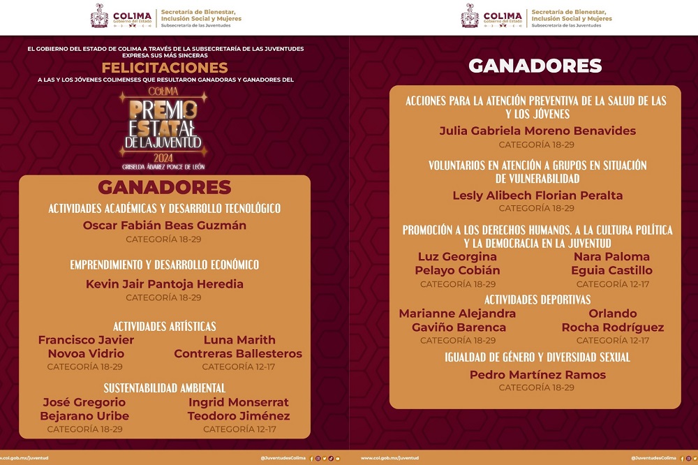 La Subsecretaría de las Juventudes del Gobierno del Estado de Colima reveló las y los ganadores del Premio Estatal de la Juventud 2024 ‘Griselda Álvarez Ponce de León’. El titular de la Subsejuv, Gerardo Romero Quezada, informó que se recibieron más de cien expedientes y tras el trabajo del Jurado Calificador, se dictaminó que siete mujeres y seis hombres son acreedores al premio, y que cuatro mujeres, siete hombres y el grupo social ‘Manos Unidas’ obtienen menciones honoríficas.