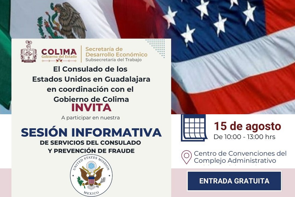 Con la finalidad de que las y los colimenses interesados en conocer aspectos relacionados con materia migratoria, laboral, civil y seguridad social, así como los requisitos para obtener la visa para laborar en el vecino país del norte, el Gobierno del Estado de Colima, a través de la Subsecretaría del Trabajo, invita a la charla con personal del Consulado General de los Estados Unidos en Guadalajara, Jalisco, que se realizará este jueves 15 de agosto en la capital colimense.