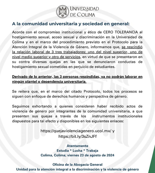 Acorde con el compromiso institucional y ético de CERO TOLERANCIA al hostigamiento sexual, acoso sexual y discriminación en la Universidad de Colima y en el marco del procedimiento previsto en el Protocolo para la Atención Integral de la Violencia de Género, informamos que, se rescindió la relación laboral de 3 tres trabajadores: uno del nivel superior, uno de nivel medio superior y otro de servicios, en virtud de que se presentaron en su contra diversas quejas en las que se denunciaron conductas de hostigamiento sexual cometidas en perjuicio de estudiantes.