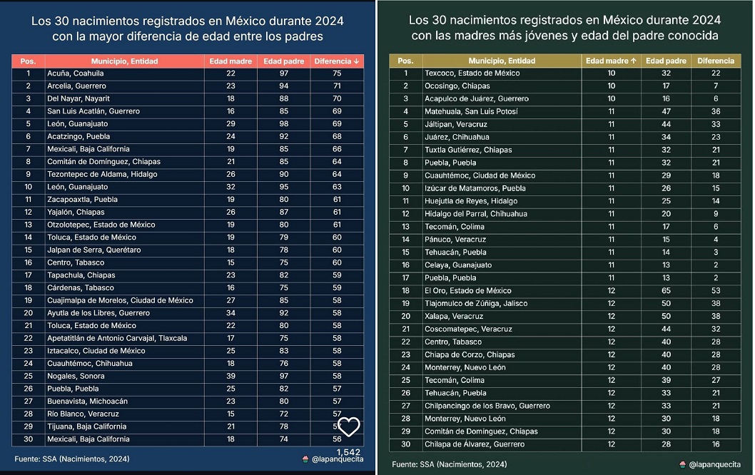 En un comunicado, la organización adjunta la tabla: “Los 30 nacimientos registrados en México durante 2024 con las madres más jóvenes y edad del padre conocida”, estando en el número 13 la niña de 11 años, en donde se indica que el padre tiene 17 años, siendo una diferencia de 6 años entre la pareja; mientras que en número 25 la otra menor, de apenas 12 años de edad, se señala que el padre tiene 39 años, es decir que hay una diferencia de 27 años entre la mujer y el hombre.