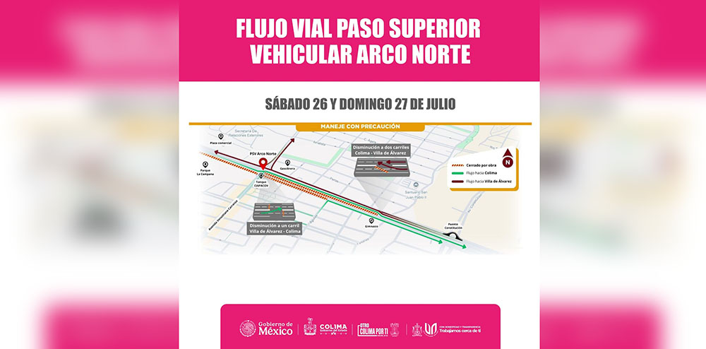 Por las obras de construcción del Arco Norte, a partir de este sábado 26 de julio se inhabilitarán los carriles centrales del Paseo Miguel de la Madrid Hurtado (Tercer Anillo Periférico) en el sentido de Villa de Álvarez hacia Colima, desde la avenida Venustiano Carranza hasta la calle Palma Ruvelina.