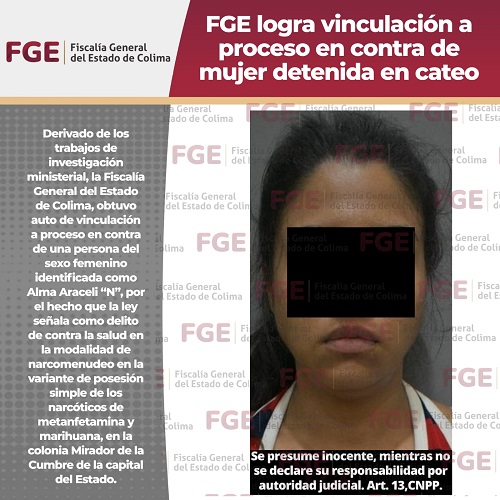 Derivado de los trabajos de investigación ministerial, la Fiscalía General del Estado de Colima, obtuvo auto de vinculación a proceso en contra de una persona del sexo femenino identificada como Alma Araceli “N”, por el hecho que la ley señala como delito de contra la salud en la modalidad de narcomenudeo en la variante de posesión simple de los narcóticos de metanfetamina y marihuana, en la colonia Mirador de la Cumbre de la capital del Estado.