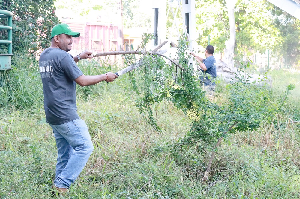 Durante la jornada se realizaron labores de poda de árboles, corte de pasto, recolección de basura y residuos, aplicación de pintura en el puente, revisión del sistema de alumbrado, así como limpieza del camellón central en la avenida Cristóbal Colón, desde la calle Juárez hasta Medellín.