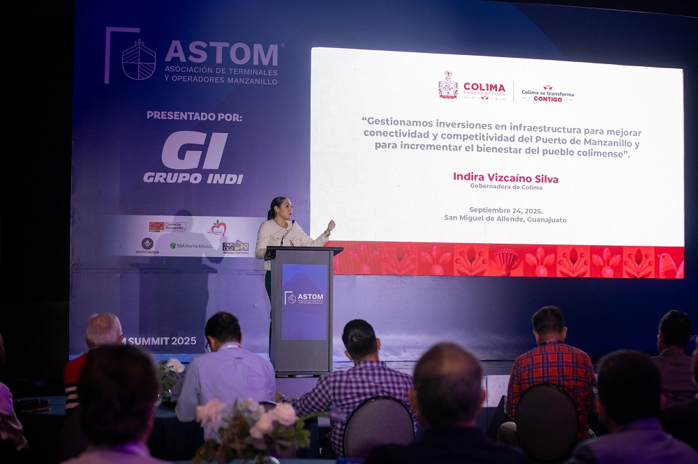 La gobernadora del estado de Colima, Indira Vizcaíno Silva, presentó la tarde de este miércoles la conferencia "Gestionamos inversiones en infraestructura para mejorar conectividad y competitividad del Puerto de Manzanillo y para incrementar el bienestar del pueblo colimense" durante la reunión Astom Summit 2025, efectuada en San Miguel de Allende, Guanajuato.