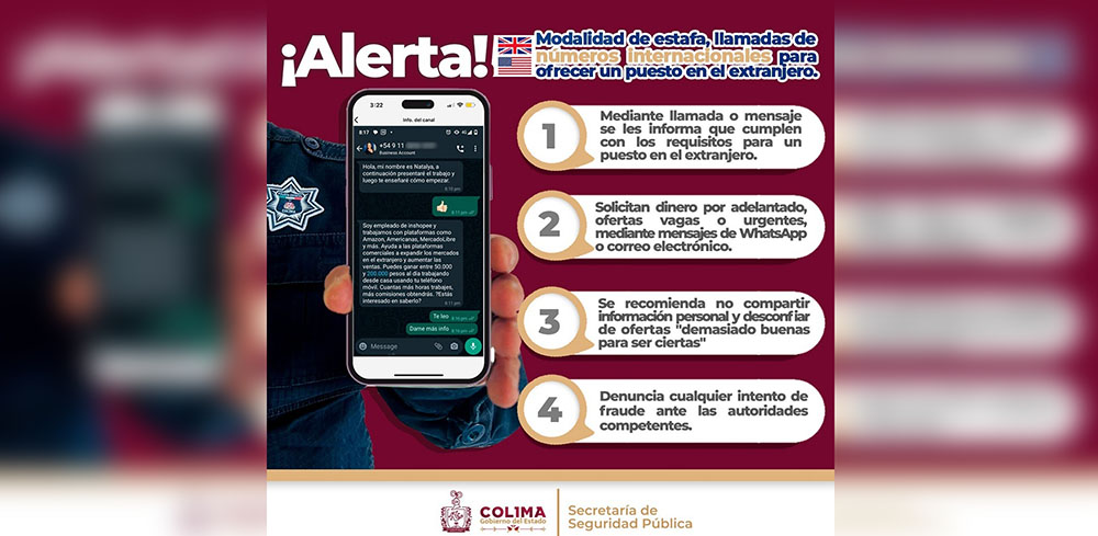 La Secretaría de Seguridad Pública (SSP) del Gobierno del Estado de Colima, alerta a toda la población, pues en los últimos días se ha detectado un aumento en el número de llamadas fraudulentas, en su mayoría provenientes de números internacionales -Estados Unidos e Inglaterra, entre otros-, que ofrecen supuestas oportunidades de empleo en el extranjero. Estas llamadas buscan aprovechar la necesidad laboral de muchas personas y su interés por trabajar fuera del país, presentando falsas ofertas laborales, para obtener beneficios económicos de manera ilícita.