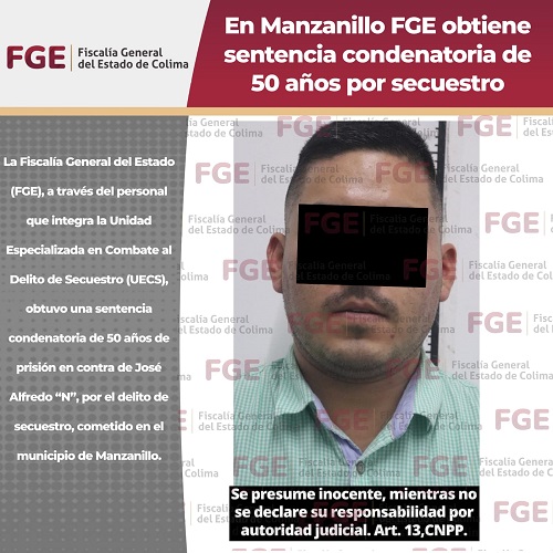 La Fiscalía General del Estado (FGE), a través del personal que integra la Unidad Especializada en Combate al Delito de Secuestro (UECS), obtuvo una sentencia condenatoria de 50 años de prisión en contra de José Alfredo “N”, por el delito de secuestro, cometido en el municipio de Manzanillo.