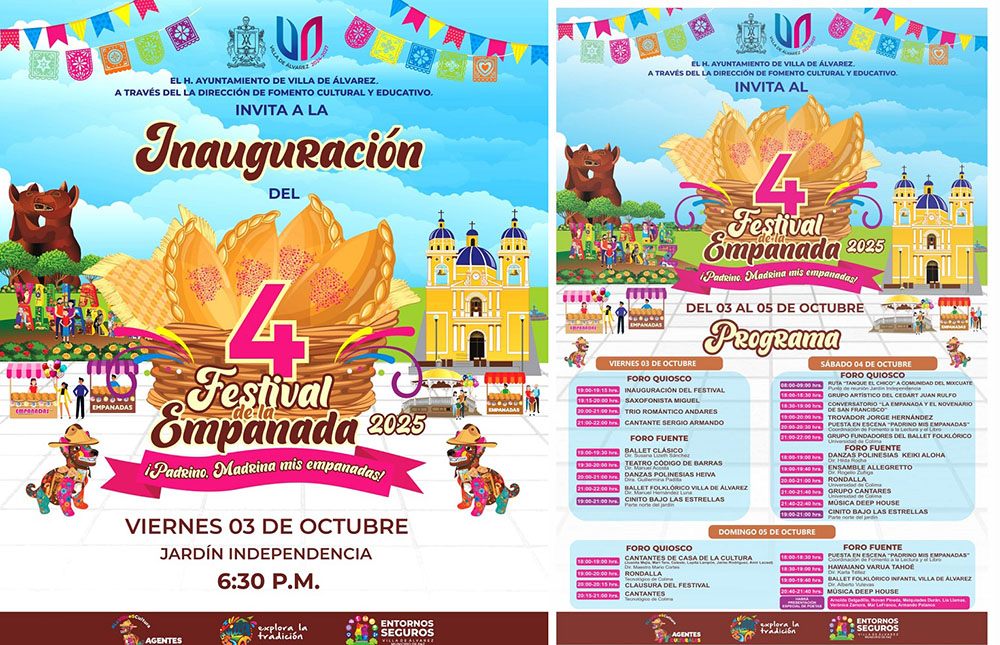 Con presentaciones de música de jazz y de trío, una puesta en escena y tres grupos de danza, este viernes en punto de las 7:00 de la noche la Presidenta Tey Gutiérrez Andrade inaugurará en el Jardín Principal de Villa de Álvarez el Cuarto Festival de la Empanada 2025, ¡padrino, madrina mis empanadas!