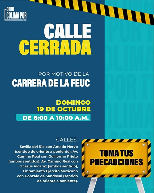 El Ayuntamiento de Colima informa a la ciudadanía que este domingo 19 de octubre, de 6:00 a.m. a 10:00 a.m., se realizarán cierres parciales en diversas vialidades de la capital con motivo de la Carrera FEUC–UdeC, un evento deportivo que promueve la salud, el deporte y la convivencia familiar.