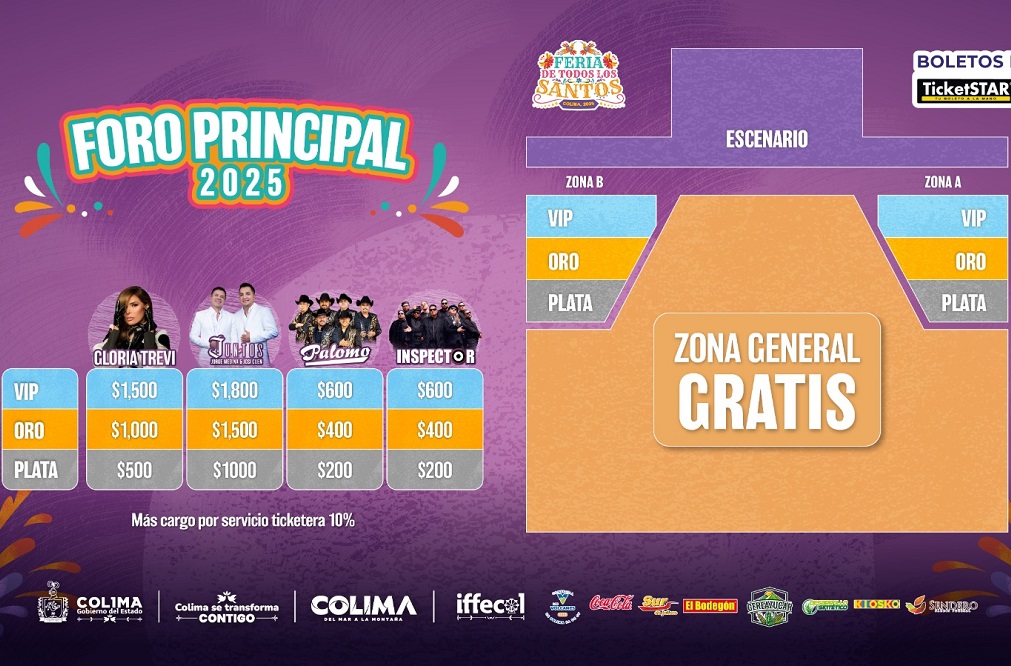 El Foro Principal de la Feria de Todos los Santos Colima 2025 nuevamente contará con zona preferente, que estará ubicada a los costados de esta explanada, donde el Gobierno del Estado de Colima ofrecerá cinco conciertos masivos gratuitos.