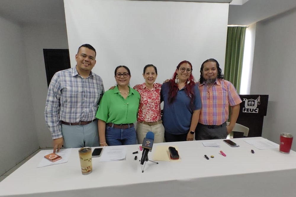 Este miércoles, en rueda de prensa, Ana Josefina Cuevas Hernández, directora de la FALCOM; Alma Cecilia Sánchez Pulido, en representación de Carolina Venegas Ochoa, presidenta de la FEUC; Anna Karina Alcántar García, presidenta de la Asociación de Egresados de Comunicación; Arnoldo Delgadillo Grajeda, presidente de la Asociación de Egresados de Periodismo; y José Alberto Llanes Castillo, presidente de la Asociación de Egresados de Letras Hispanoamericanas y Lingüística, dieron a conocer los detalles del programa Exa- FALCOM.