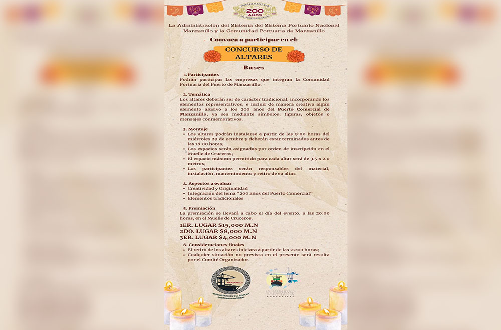 Manzanillo, Col. La Administración del Sistema Portuario Nacional Manzanillo y la Comunidad Portuaria están convocando a las empresas que integran el sector, a participar en el tradicional Concurso de Altares de Muertos, que habrá de verificarse el miércoles 29 de octubre a partir de las 18 horas