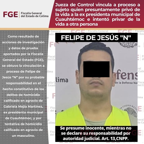 Como resultado de acciones de investigación y datos de prueba aportados por la Fiscalía General del Estado (FGE), se obtuvo la vinculación a proceso de Felipe de Jesús “N” por su probable responsabilidad en el hecho constitutivo de los delitos de homicidio calificado en agravio de Gabriela Mejía Martínez, ex presidenta municipal de Cuauhtémoc, y por tentativa de homicidio calificado en agravio de un masculino.