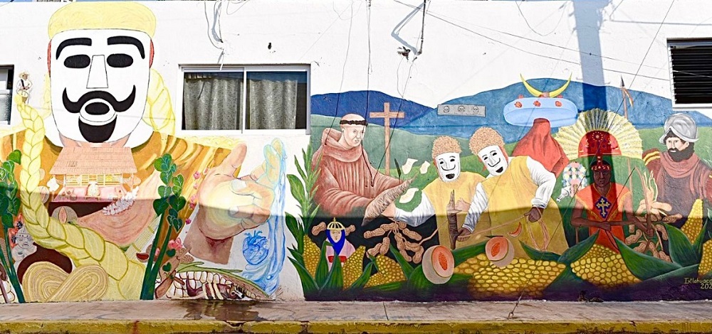 Este mural, elaborado con la participación de habitantes de la localidad -de diferentes edades-, reúne elementos distintivos de la historia y el legado artístico de la comunidad indígena de Ixtlahuacán: en él aparece el capitán Gonzalo de Sandoval junto a un danzante ataviado con la indumentaria típica de la Danza de Apaches, recordando la conquista y la resistencia indígena.