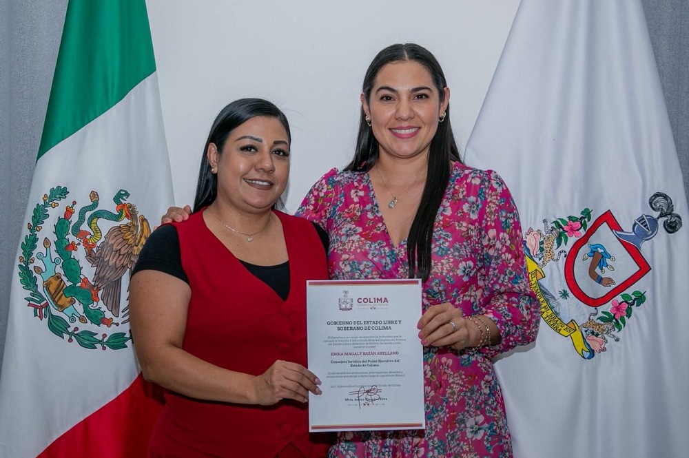 La gobernadora Indira Vizcaíno Silva entregó este viernes el nombramiento a Erika Magaly Bazán Arellano como nueva consejera jurídica del Poder Ejecutivo del Estado de Colima, quien releva en el cargo a Consuelo del Carmen Landeros Castellanos.